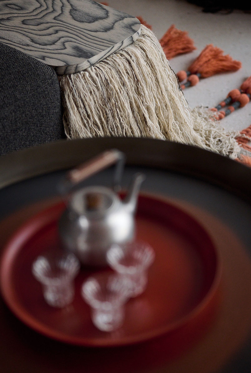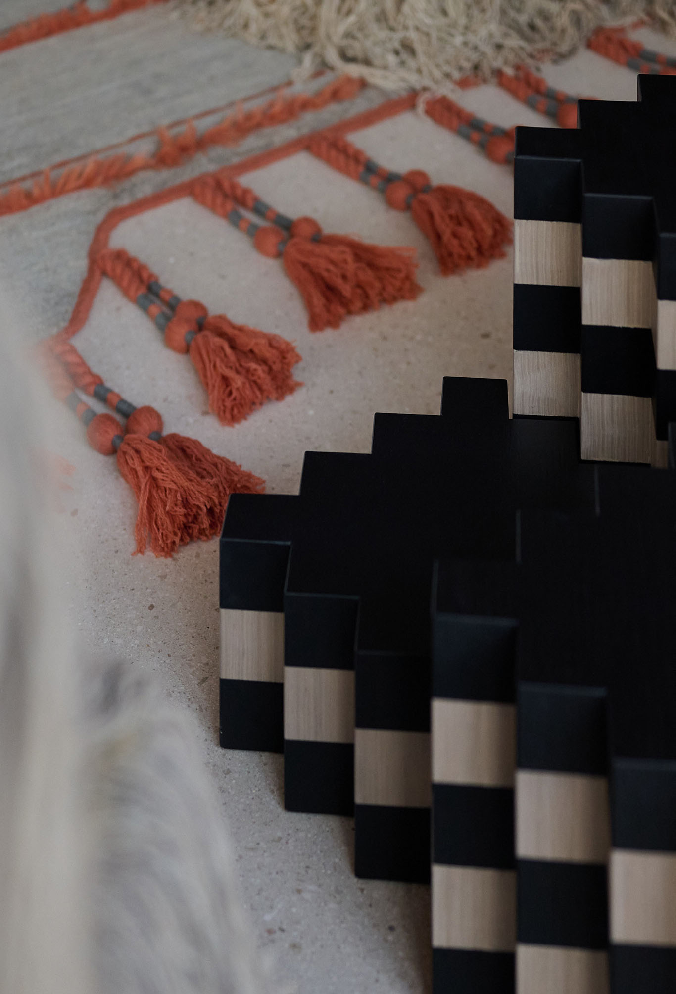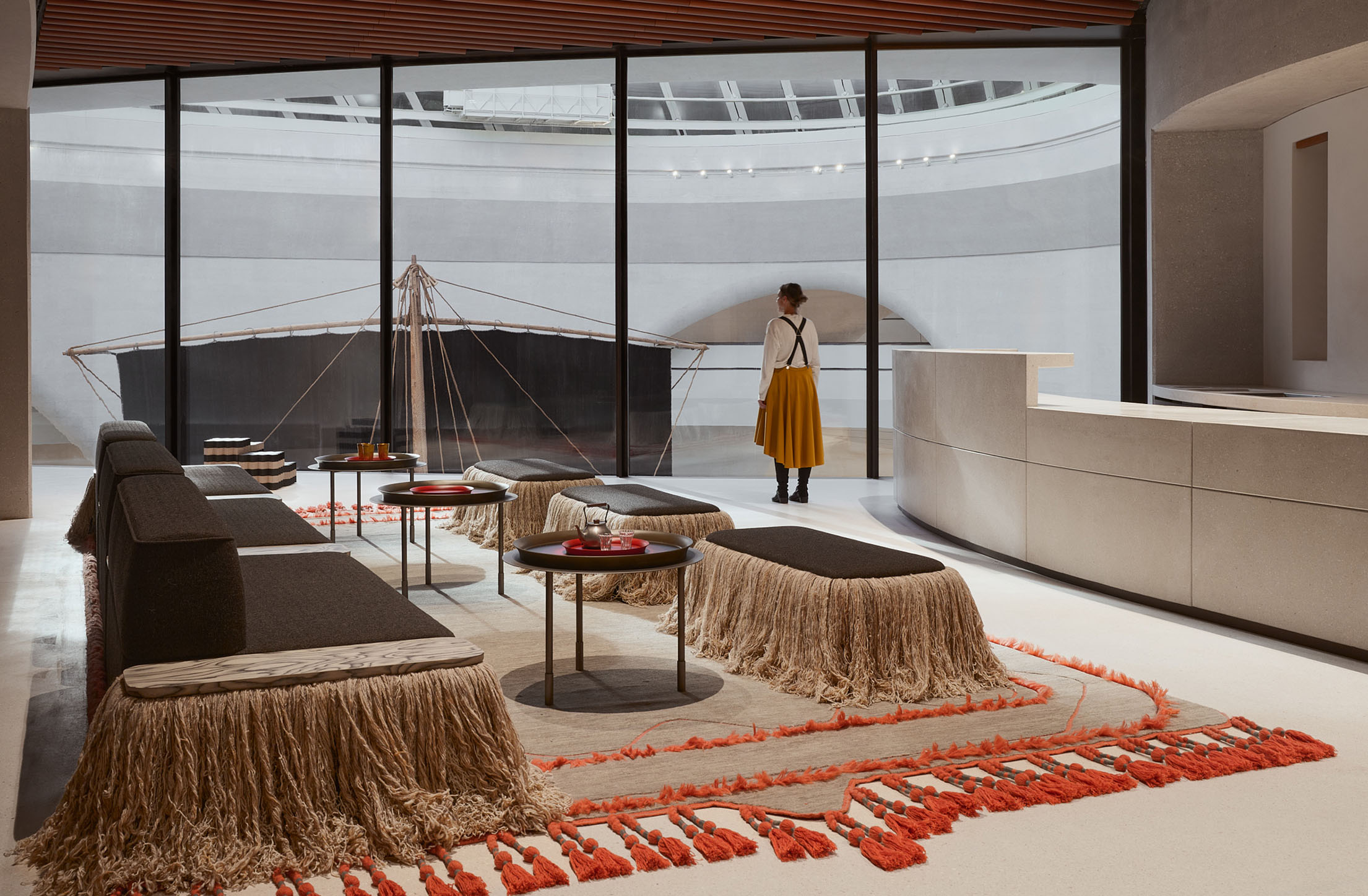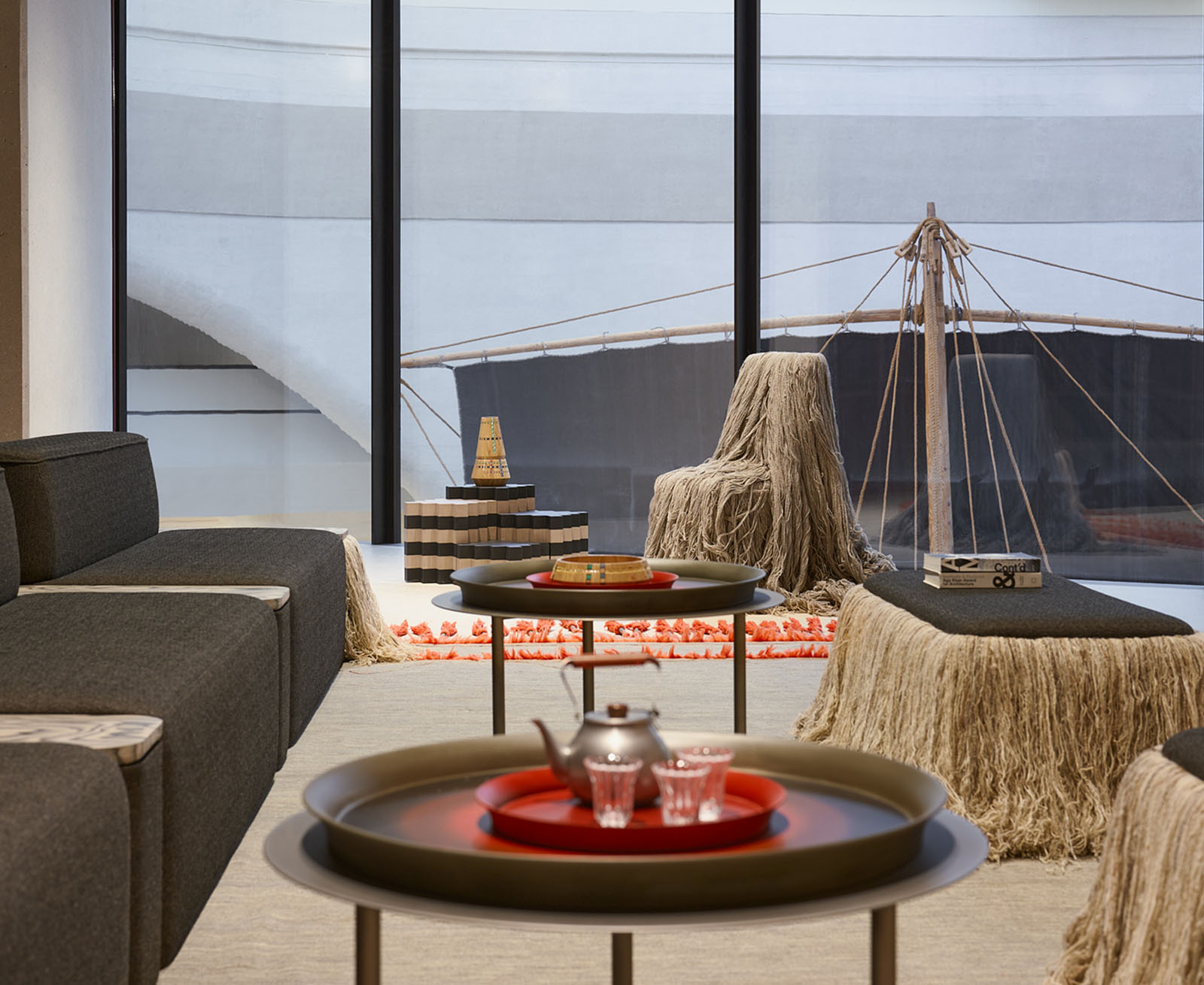 The Research Library adopts a striking opposition of black and white with unruly strands of wool used for the sofa system and the feature Nomad chair; a palette of metals, derived from stacked pots used to serve shared dishes, their patina culminating in deep red colour of a hearth, echoing the visual economy of Bedouin tents and tools.