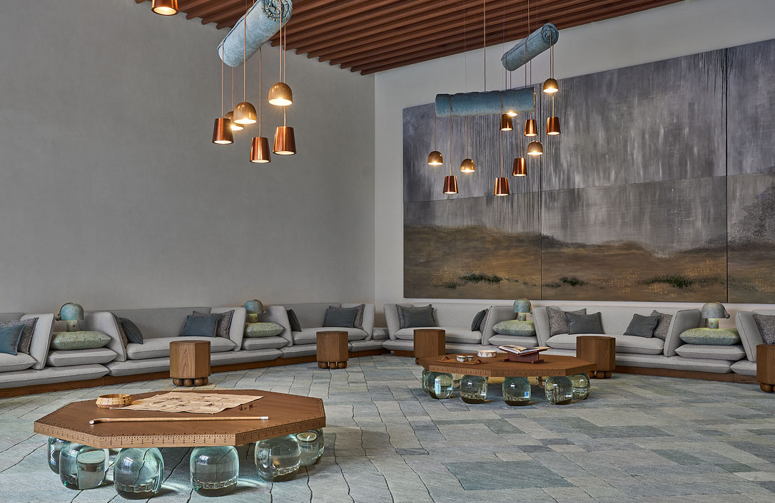 The design of Al Hurr 2 majlis, is informed by the most intense period of heat in Al Drour calendar, Al Qaith. Warm, saturated tones and a more concentrated palette define the space, accompanied by artwork that subtly recalls the hazy atmosphere of the desert during peak summer conditions.