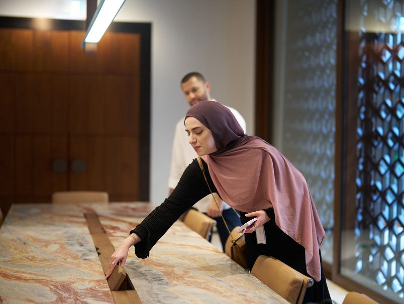 Overlooking the museum’s atrium, the Research Library is oriented toward the Magan Boat as a constant visual presence. The spaces draw on Bedouin material heritage, with raw wool, dark timber, and metal creating a tactile, grounded environment. Custom coffee tables and carpets, finished with hand-crafted tarbushes, create a setting for both focused research and informal exchange.