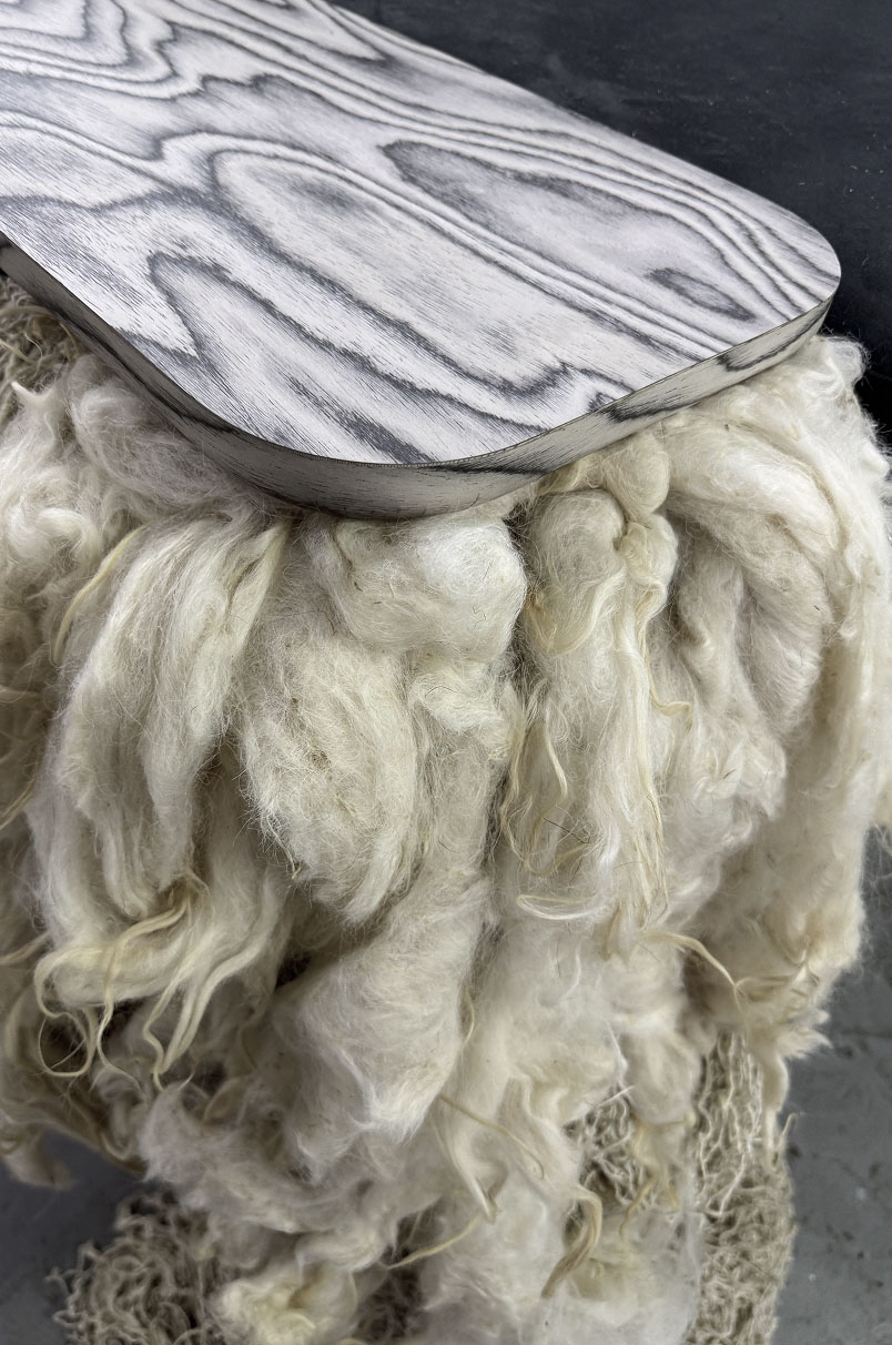 Wool trials moved between raw fleece, washing, boiling, and spinning, drawing from different fleeces and testing against the museum’s existing material palette to tune colour, density, and tactile character.